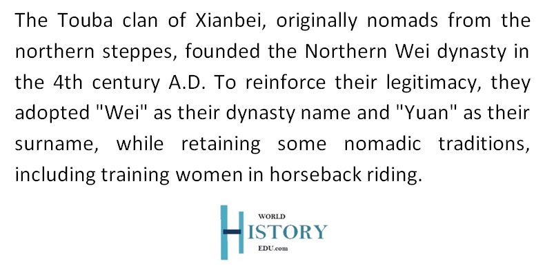 The Touba clan from Xianbei are generally regarded the people who founded the Northern Wei dynasty. This happened around the 4th century A.D. The Touba clan, who were previously nomads, emerged from the northern steppes and later made northern China their home. In order to reinforce their legitimacy, the leaders of the Touba Xianbie adopted “Wei” as their Chinese dynasty name. They also took “Yuan” as their surname. However, some them still kept some of their nomadic traditions, including training women in the art of horseback riding.