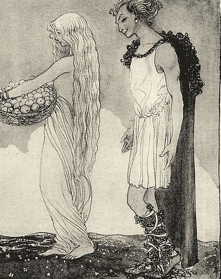 An artwork entitled “Loki and Idun”, created by Swedish artist John Bauer.