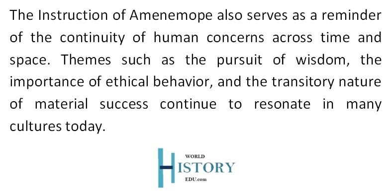 The Instruction of Amenemope is a valuable document that provides insight into the moral and intellectual world of ancient Egyptian scribes. Through its teachings, it offers a glimpse into the ideals of wisdom, responsibility, and ethical behavior that were central to Egyptian society. The text’s emphasis on knowledge, moral integrity, and the duties of civil servants reflects the values that shaped the lives of those who worked within the administrative apparatus of the state.