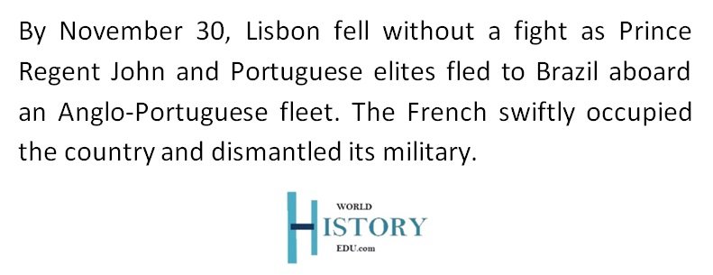 On November 30, 1807, the French entered Lisbon without resistance as the Prince Regent and his court had fled to Brazil, taking state treasures with them.