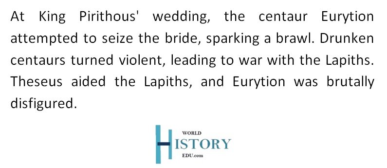 According to the myth, a brawl broke out at the wedding feast of King Pirithous, son of Ixion. The brawl broke out after the centaur Eurytion tried to adopt the bride, Hoppodamia. It is said that the centaurs were poor at handling their drink; as a result, they got very uncivilized at the feast after drinking copious amounts of wine.