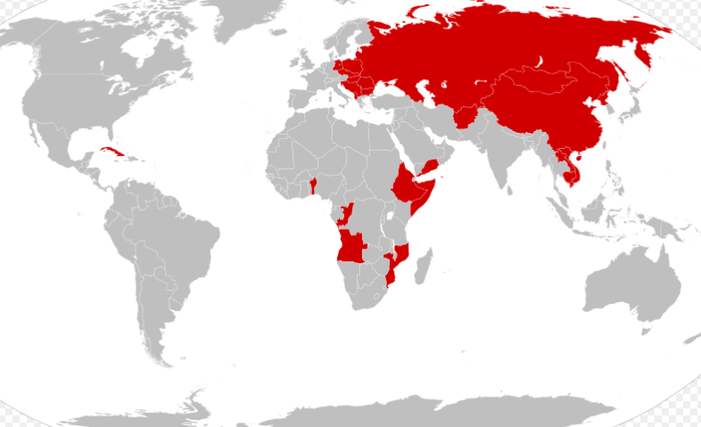 Image: A map showing countries that declared themselves socialist states under the Marxist-Leninist or Maoist definition between 1979 and 1983, marking the greatest territorial extent of socialist states. The highlighted countries include the Soviet Union, China, Vietnam, Laos, Cambodia, North Korea, Cuba, Angola, Mozambique, Ethiopia, Benin, and Afghanistan.
