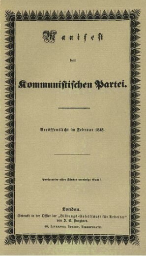 Marx’s main works include “The Communist Manifesto” (1848), co-authored with Friedrich Engels, and the three-volume “Das Kapital” (1867–1894). Image: The first edition of The Manifesto of the Communist Party, published in German in 1848