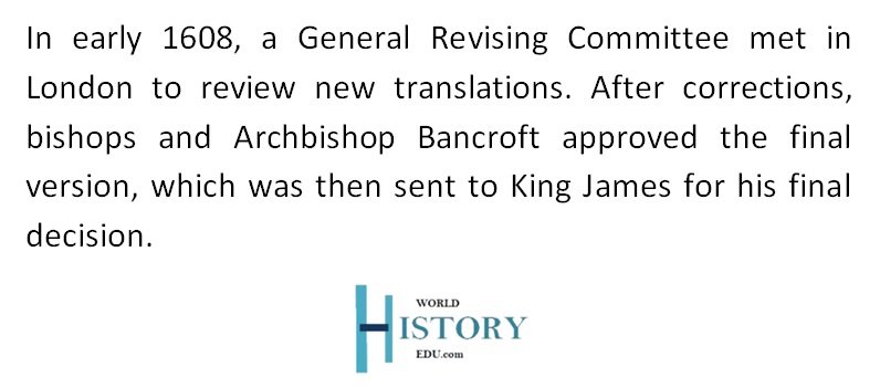 In early 1608, a General Revising Committee met at the Stationers’ Hall, London where they listened to the new translations from the six units. They listened attentively to the reading and the portions the committee felt did not sound right were reviewed and corrected. After corrections were made the revised work was sent to the few Bishops who also reviewed the final version to the Archbishop of Canterbury. Archbishop Bancroft gave his final approval on the translation and sent it to King James who had the final say on the new translation.