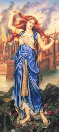 Cassandra by Evelyn De Morgan (1898, London); Cassandra in front of the burning city of Troy at the peak of her insanity.