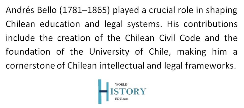From drafting the Chilean Civil Code to founding the University of Chile, Bello’s achievements reflected his dedication to creating a strong, unified, and progressive society.