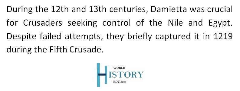 Throughout the 12th and 13th centuries, the Egyptian port city of Damietta was really important to Western crusaders. This was because anyone who controlled Demietta controlled the Nile. Also, the port city was seen as a good launching pad to invade Egypt. In between the Second and Third Crusades, around 1169, Christian forces from the Kingdom of Jerusalem sent a fleet, with support from the Byzantine Empire, to capture the port. However, their attack was repelled by a fierce Muslim resistance led by Saladin, the a Muslim warrior and founder of the Ayyubid Dynasty. Similarly, the Western forces focused on Damietta during the Fifth Crusade (1217-1221). In 1219, the Crusaders managed to capture Damietta after a very hard-fought siege.