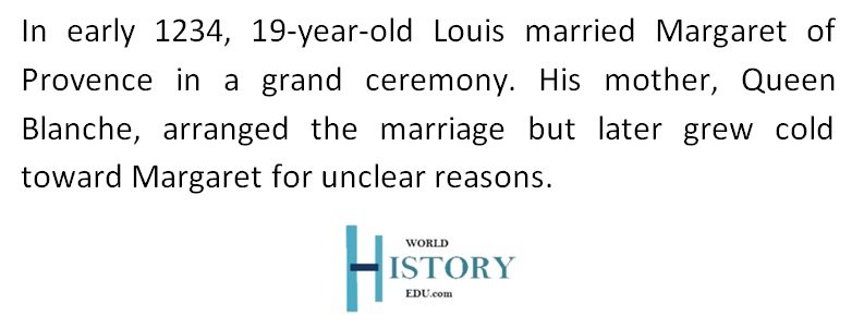 In early 1234, at age 19, Louis married Margaret of Provence, the sister of Eleanor of Provence (the wife of Henry II of England) in a lavish ceremony held at the cathedral of St. Etienne. Margaret was crowned queen of France the following day.