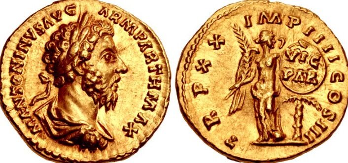 Aureus of Marcus (176–177) features trophy piles symbolizing the Marcomannic Wars’ conclusion. Inscription: M. ANTONINVS AVG. GERM. SARM. / TR. P. XXXI, IMP. VIII.