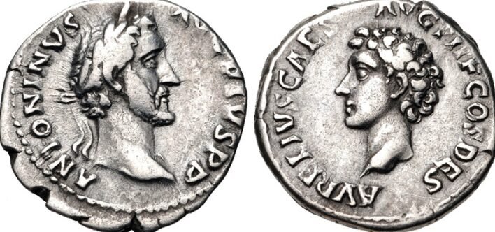 Related to Hadrian and Antoninus Pius, he studied under eminent tutors and co-ruled briefly with Lucius Verus. Image: Denarius of Antoninus Pius (AD 139) features Marcus Aurelius’s portrait on the reverse. Inscription: ANTONINVS AVG. PIVS P. P. / AVRELIVS CAES. AVG. PII F.