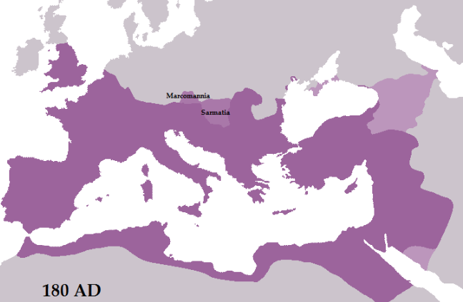 At Marcus Aurelius’s death in 180, the Roman Empire (purple) included incomplete annexations of Marcomannic and Jazyge lands, with dependencies (light pink) like Armenia and Iberia.