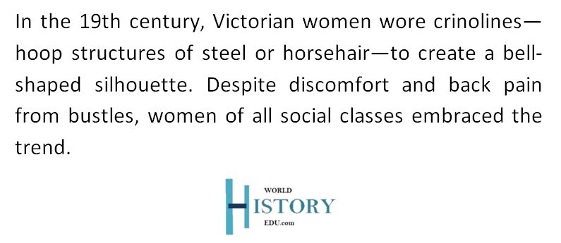 Another very common fashion trend from the 19th century and the Victorian era (1830s to early 1900s) were the crinoline and bustles women used.