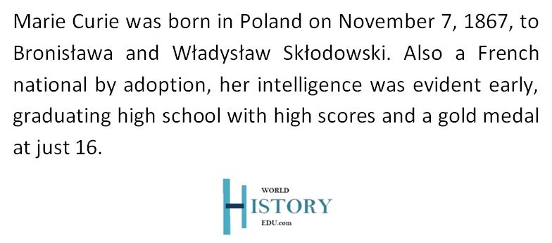 Marie Curie was born in Poland on 7th November 1867 to parents Bronisława (née Boguska) and Władysław Skłodowski. By adoption, she was also a French national. Curie’s intelligence showed up early during her childhood days. She finished high school with high scores and was given a gold medal. At that time, she was only 16.