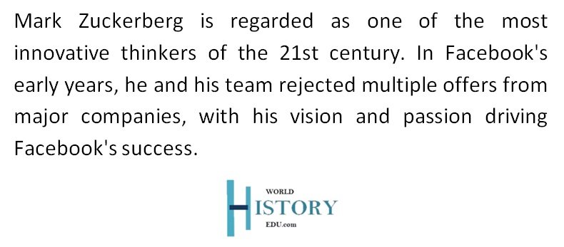 Mark Zuckerberg is often hailed as one of the most innovative thinkers and programmers of the 2st century. For example, the year that Facebook was launched, Zuckerberg and his friends consistently turned down several offers by big American companies to buy the site. His innovative vision and passion were key ingredients in helping Facebook become one of the most successful companies in history.