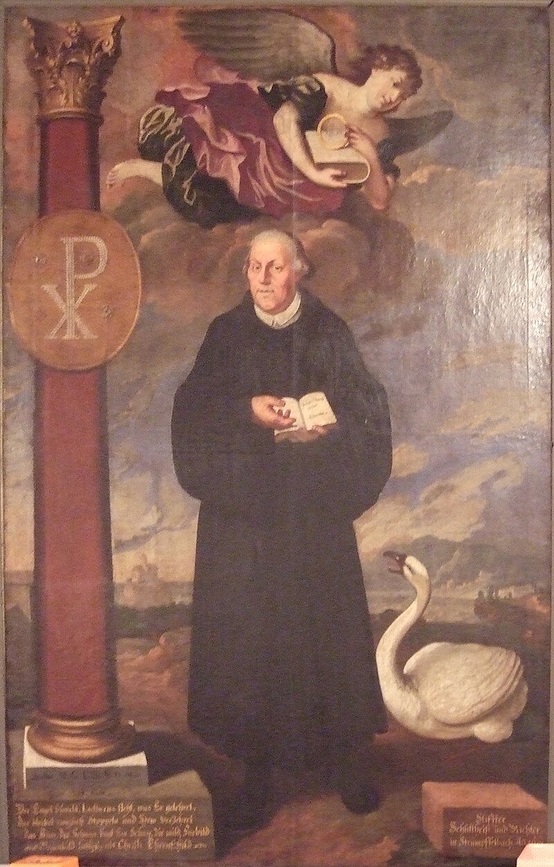 Martin Luther, born in Eisleben, Germany in 1483, played a pivotal role in the Protestant Reformation. In 1517, he publicly challenged the Catholic Church by posting his 95 Theses on the Castle Church’s door in Wittenberg. This act questioned the Church’s controversial sale of indulgences, igniting widespread theological debate. Central to Luther’s teachings was the principle of justification by faith alone, which later became foundational for Protestant theology. Image: Luther with a swan (painting in the church at Strümpfelbach im Remstal, Weinstadt, Germany, by J. A. List)