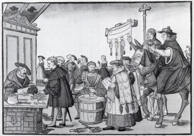 Luther’s theses, which criticized the indulgences and called for a public debate on their validity, spread rapidly through Europe thanks to the recent invention of the printing press. The Catholic sale of indulgences shown in A Question to a Mintmaker, woodcut by Jörg Breu the Elder of Augsburg, c. 1530