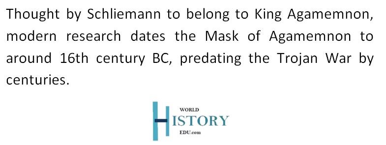 German businessman and amateur archeologist Heinrich Schliemann, influenced by Homeric legend, believed the mask belonged to Agamemnon, the mythical king of Mycenae and leader of the Achaeans in The Iliad. He associated the discovery with the Trojan War.