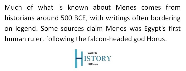 Aside from the Turin Papyrus, much of what we know about Menes came from historians starting around 500 BCE. And much of what was written about Menes bordered on slight exaggeration and legend. According to some sources, the pharaoh was the first human ruler of Egypt, with the previous ruler being the falcon-headed god Horus.