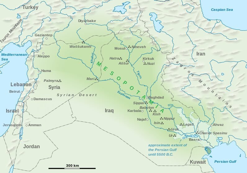 Mesopotamia, within the Tigris-Euphrates river system in the northern Fertile Crescent, historically included parts of modern Iraq, Iran, Turkey, Syria, and Kuwait. This area was central to the development of ancient civilizations. Image: A map showing the regions that really made up Mesopotamia.