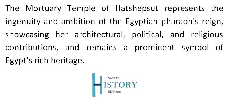 The Mortuary Temple of Hatshepsut reflects ancient Egypt’s funerary traditions and evolving religious beliefs. It honored Amun-Re, the state god, while celebrating Hatshepsut’s divine kingship and achievements. Its design embodied the spiritual journey of life, death, and rebirth, linking the living pharaoh to the gods and the afterlife.