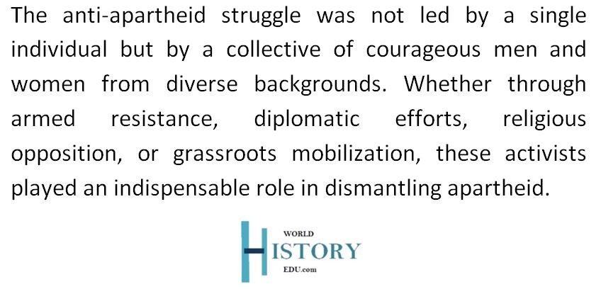 The struggle against apartheid in South Africa was waged by a diverse group of activists who employed various strategies, including peaceful resistance, armed struggle, international advocacy, and political leadership. These individuals, drawn from different racial and social backgrounds, played a crucial role in dismantling institutionalized racism and shaping a democratic South Africa.