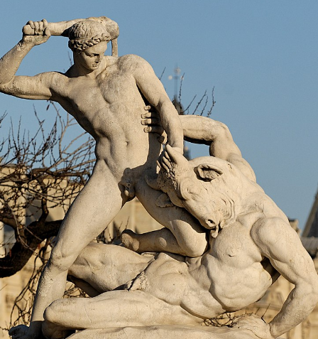 The thread produced by Icarus and his father Daedalus proved invaluable in Theseus quest to slay the Minotaur. The Athenian hero is said to have vanquished the monster with his bare hands and a very powerful club. | Image: Theseus Fighting the Minotaur, 1826, by Jean-Etienne Ramey, marble, Tuileries Gardens, Paris
