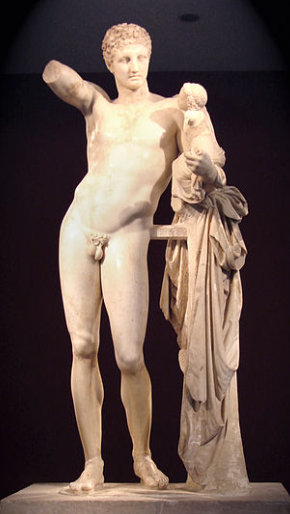 Carved from Parian marble, this statue by Praxiteles (circa 400 BCE) depicts Hermes carrying baby Dionysus. Discovered in 1877, it remains largely intact despite missing some arms. Image: Greek god Hermes bearing the infant Dionysus, by Praxiteles, Archaeological Museum of Olympia