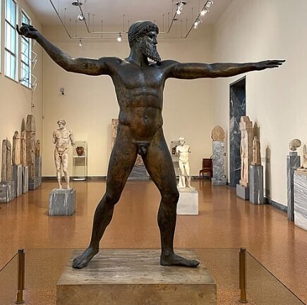 The Zeus or Poseidon of Artemision is a striking bronze statue from the early Classical period, created around 460 BCE. The statue was recovered from a shipwreck off the coast of Cape Artemision and is now housed in the National Archaeological Museum of Athens. The figure is depicted in a powerful stance, preparing to hurl a thunderbolt or trident, although it remains unclear whether the statue represents Zeus, the king of the gods, or Poseidon, the god of the sea.