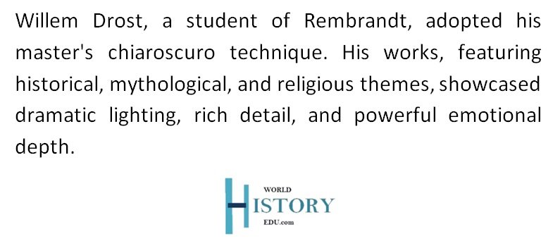 Willem Drost was a pupil of Rembrandt and absorbed many of his master’s techniques and style. His works often displayed a dramatic use of light and shadow, reminiscent of Rembrandt’s chiaroscuro technique. His paintings featured historical and mythological subjects, as well as religious narratives, and he had a talent for capturing intense emotions and intricate details.