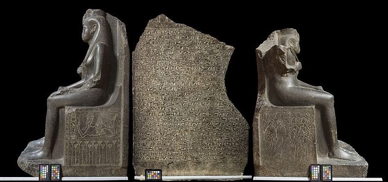 Image: Side view of the double statue of Horemheb and Mutnedjemet.