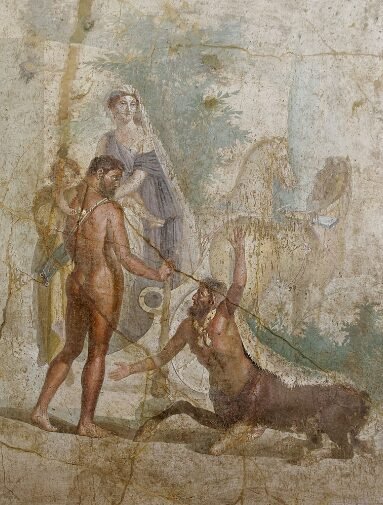 Heracles carrying his son Hyllus as the centaur Nessus prepares to ferry Deianira across the river. Pompeii fresco.