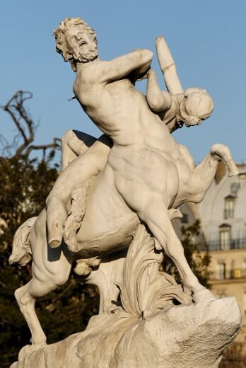 In Greek mythology, Nessus was a notable centaur and son of Centauros. Image: 2006 photo of Laurent Marqueste’s statue depicting Nessus struck by an arrow with Deianeira.