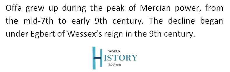 Offa was fortunate to have grown up in an era when the Mercian Kings were at the height of their power. According to historians, this period was from the mid-7th century to the early 9th century. The decline in Mercian kings’ power came during the reign of Egbert of Wessex in the 9th century.
