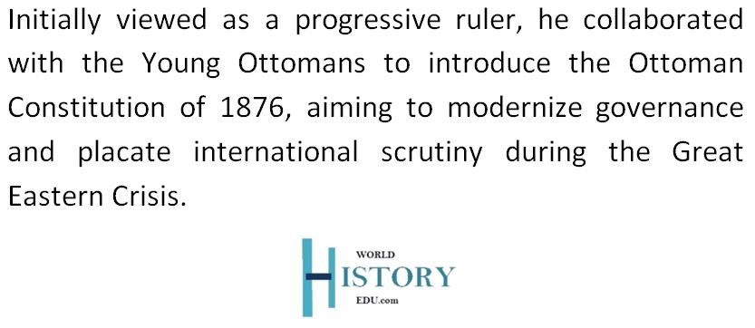 Amid the Russo-Turkish War and internal instability, he suspended the 1876 Constitution in 1878 to consolidate power, ruling without a parliament for three decades.