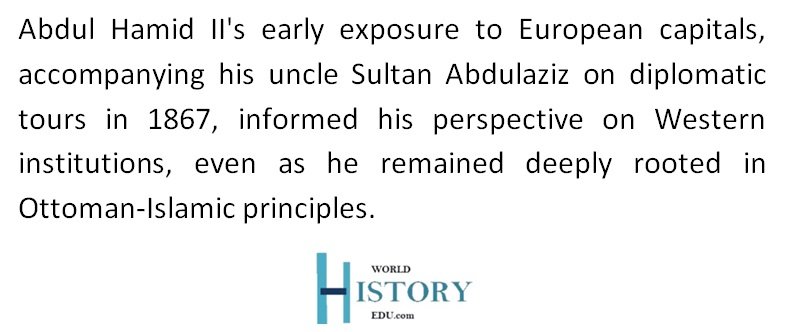 His formative experiences included accompanying his uncle, Sultan Abdulaziz, on a grand tour of France, Britain, and other European states in 1867. That journey exposed him to Western institutions, creating a mixed impression of admiration and suspicion.