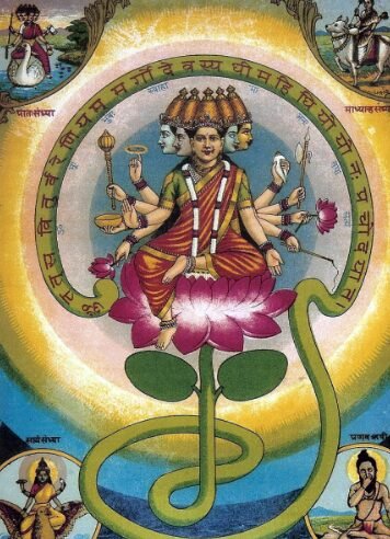 Gayatri, the personification of the Gayatri Mantra, is depicted with five faces. Four faces represent the four Vedas, while the fifth face symbolizes the Ultimate Reality, or Brahman.