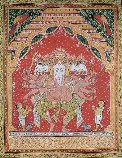 Ganesha, the elephant-headed god of wisdom and remover of obstacles, is sometimes depicted with five faces in a form known as Heramba or Panchamukha Ganesha. In this form, Ganesha’s five heads symbolize different aspects of existence and consciousness, particularly the five koshas, or sheaths, which cover the soul in Hindu philosophy. These koshas represent the layers of the human self, ranging from the physical body to the deepest spiritual core: