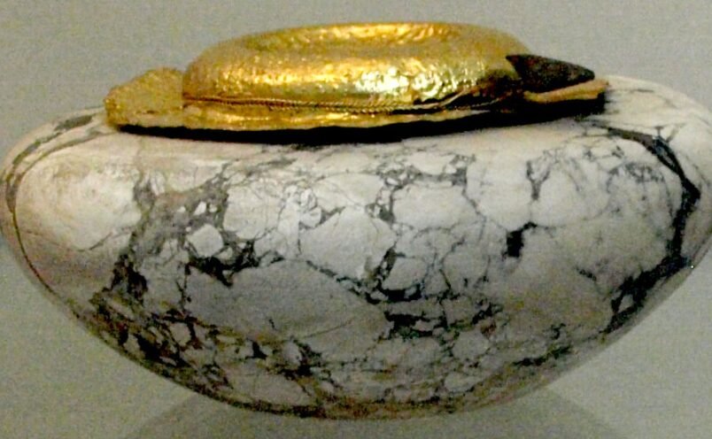 Limestone vessel with a gold cover from the tomb of Khasekhemwy