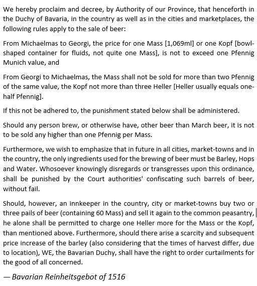 Bavarian Reinheitsgebot of 1516 (emphasis added), Eden, Karl J. (1993). “History of German Brewing”. Zymurgy. 16 (4).