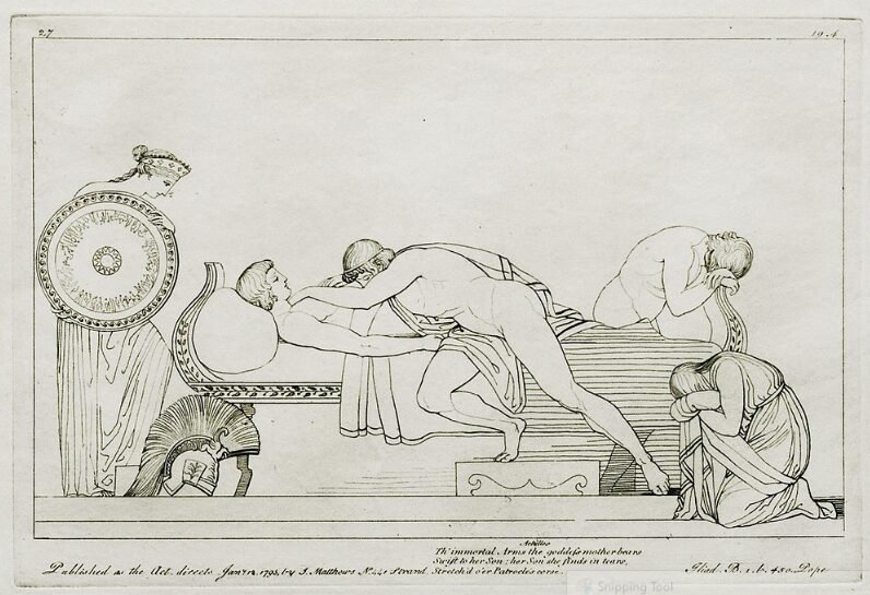 While Homer does not explicitly depict them as lovers, later Greek authors, including Aeschylus, Aeschines, and Plato, often portrayed their relationship as romantic. Image: Achilles mourning Patrocles, British artist John Flaxman, 1795.