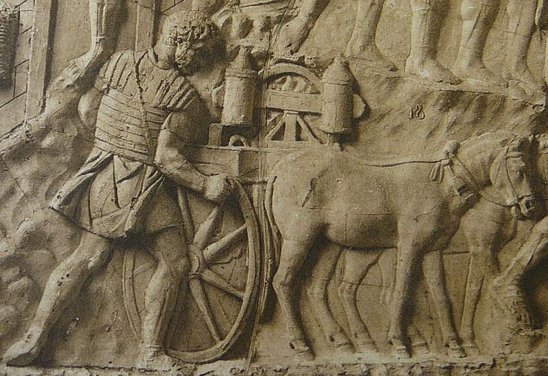 The carroballista was a cart-mounted, bolt-firing weapon depicted on Trajan’s Column. It had wider-set spring mechanisms for better accuracy and a lighter iron frame, making it more mobile and increasing its power by about 24%.
