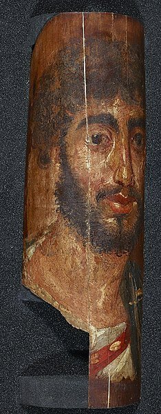 Encaustic and tempera-painted Fayum mummy portrait of a Roman officer (circa 160–170).