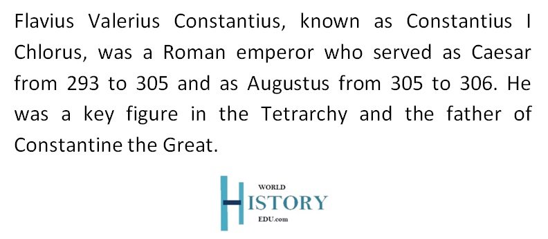 As Caesar from 293 to 305 and Augustus from 305 to 306, Constantius was instrumental in securing Roman frontiers, suppressing rebellions, and setting the stage for the rule of his son, Constantine the Great, the first Christian emperor of Rome. His nickname “Chlorus”, meaning “the Pale,” was popularized by later Byzantine historians but was not used during his lifetime.