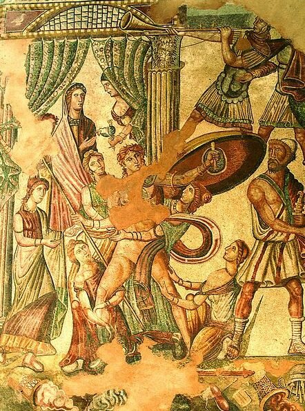 Late Roman mosaic depicts Achilles disguised among Skyros princesses, discovered by Odysseus.