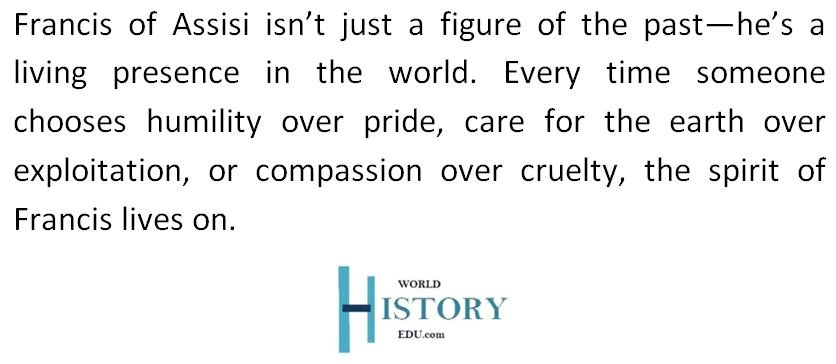 Francis inspired a global religious movement, influenced Christian spirituality, art, and ecology, and remains a model of humility, peace, and care for the marginalized.