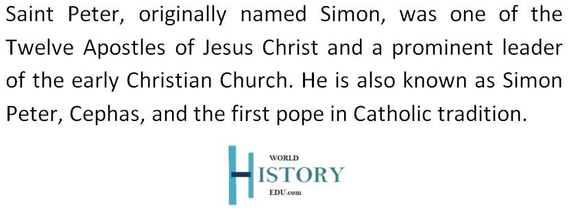Saint Peter, also known as Simon Peter, Simon, Simeon, or Cephas, was one of the Twelve Apostles of Jesus Christ and among the first leaders of the early Christian Church. Born as Shimon Bar Yonah, he lived during the 1st century and played a critical role in the foundation of Christianity. He is venerated as a major saint across various Christian denominations, with Catholic tradition identifying him as the first Pope and the inaugural bishop of Rome and Antioch.