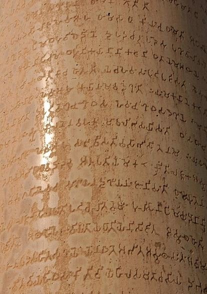 The early history of slavery in India is debated, focusing on terms like dasa and dasyu. Megasthenes claimed slavery was banned in the Maurya Empire, while Ashoka’s edicts mention obligations to slaves. Image: The Delhi-Topra pillar in Delhi, India, showing the edicts of Ashoka.