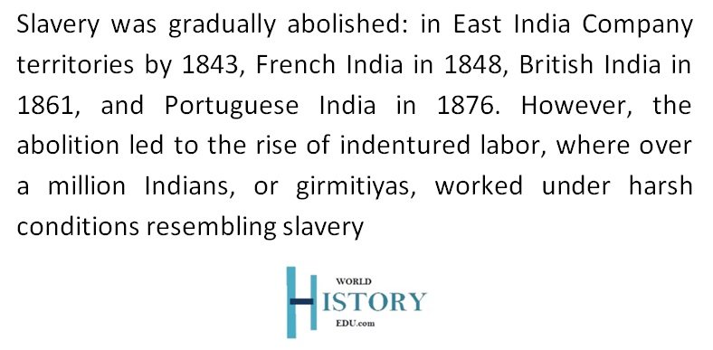 After the formal abolition of slavery, indentured labor systems replaced outright slavery. Millions of Indians, known as girmitiyas, were sent to European colonies under exploitative labor contracts, often facing harsh conditions resembling slavery.