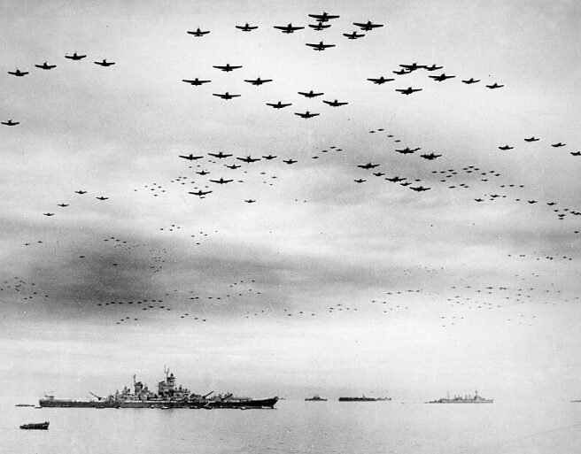 A vast formation of American planes flew over USS Missouri and Tokyo Bay, celebrating Japan’s surrender.