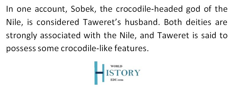 In one account, Sobek – the crocodile-headed god of the Nile – is regarded as the husband of Taweret. Both deities have strong links to the Nile River; besides, Taweret herself is said to have some features of a crocodile.